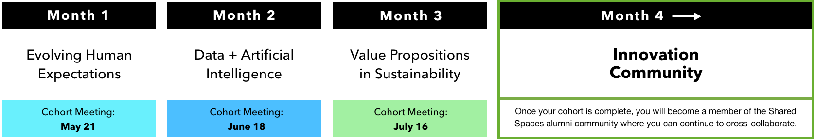 Your engagement in Shared Spaces starts with an immersive 3-month cohort program where you’ll connect with leaders from various industries. During these 3 months, you will meet remotely on a monthly basis to explore innovations and technologies driving the future.