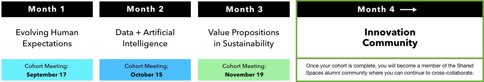 Your engagement in Shared Spaces starts with an immersive 3-month cohort program where you’ll connect with leaders from various industries. During these 3 months, you will meet remotely on a monthly basis to explore innovations and technologies driving the future.